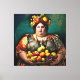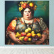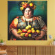 "Goddess of Overindulgence" Colourful Portrait. A mischievous nod to classical depictions of earth goddesses, this portrait transforms the symbolism of fertility and harvest into a wry commentary on modern consumption and identity. Rich textures and theatrical styling lend timeless weight to its satire. With apples, pears and grapes in vibrant colours of yellows, greens and reds.