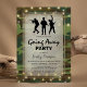 Personalized military party invitations to celebrate a soldier going away on national service, or to celebrate them coming home. Featuring a camouflage background, a vintage overlay centrepiece, marine troops, string lights, and a modern party template.