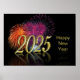 Flambant précieux Nouvel An 2025 avec typographie élégante lettre/numéro d'or 3D 2025 avec un feu d'artifice coloré sur un arrière - plan noir.