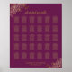 This beautiful wedding seating chart features a simple yet elegant design with a magenta or cassis purple coloured background, gold faux foil frills or floral filigree in the corners and a script calligraphy title reading "please find your table." The chart has table assignments for 300 guests at 30 tables (10 seats per table.)