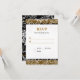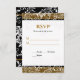 Add this Gold and Black Elegant Wedding RSVP Card to your Wedding Invitation Package. Designed with a graphic gold design on a black and white background. To personalize, simply add your Reply By Date Information and the Bride & Groom's First Names into our easy template, replacing the sample text.