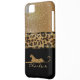 Stylish iPhone 5C case done in solid black, on the bottom half of the case and graphics of a gold glitter look, on the top half. Graphics of a tan, brown and black leopard spotted ribbon, runs across the middle and a leopard decorates the black bottom of the case. Personalize the tan text to read what you want. Great personalized gift idea.