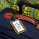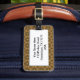 This luggage tag features a repeating tiled pattern in golds and black by artist Jayne Wilson. Completely customizable with your name and address.