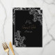 Gold and Black Wedding Reception Menu Card designed with white and gold coloured text on a black background with white accents. The text includes: the Bride and Groom's First Names and Wedding Date. The reverse side includes: Appetizer Selections, Entre Selections and Dessert Selections. To personalize, simply insert your menu selections into our easy template, replacing the sample text. Be sure to view the entire Gold and Black Wedding Collection for matching cards and accessories.