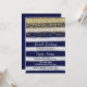 Birthday invitation with gold glitter look design and navy blue stripes watercolor background.
