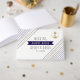 Gold, navy anchor and stripes nautical wedding guest book. This elegant and modern beach wedding design features diagonal stripes in navy blue and gold that cover the two corners and a gold glitter anchor in a gold circle.