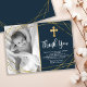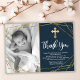 Bleu bleu marine simple et élégant baptême et vous remercie cartes. Envoyez des remerciements à votre famille et à vos amis avec cette carte à plat moderne et personnalisée. Il comporte un script "Merci" écrit à la main, autour d'un double faux cadre polygonale feuille d'or sur arrière - plan de marine. Ce magnifique carte de remerciements photo moderne sera également parfait pour le baptême / baptême / baptême / cérémonie de nom / confirmation et la communion sainte carte de remerciements pour garçon ou fille. n° 3354