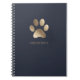 Luxurious faux gold foil paw print logo on an elegant navy blue background. This spiral notebook has a line of customizable text to personalize any way you like. Perfect for any pet related business or animal lover.