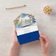 A beautiful royal blue and gold tropical leaf design all in one wedding invitation, making your wedding plans so much simpler