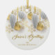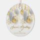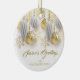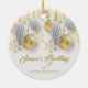 A ceramic ornament features your business name and greeting in chic lettering accented with a design of silver and gold ornaments and snowflakes. Be sure to double-check your order before adding it to your cart as what you see on the screen is what will be printed. The Live Design Service can help you with your design layout if needed.