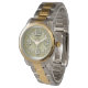 Face of watch is designed to match the gold and silver in watchband. Diamond patterned graphic background, with embossed and textured appearance in numbers. With star bullets representing the remaining eight numbers. All in shades of gold and white.
