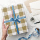 Gold and white buffalo plaid wrapping paper.