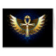 Golden Egyptian ankh with patterned, shiny wings on a black background. Magic symbol.