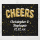 Great gift idea for bride and groom or bridal party! Celebrate a fun bridal wedding event with cool 3d like graphics of gold mylar balloons spelling out the word cheers, along with your custom text occasion or names. Cheers like toasting a drink of sparkling wine in celebration. Great for a wedding favour sticker, or for the rehearsal dinner or other celebration. Fun design wtih modern elegant star shaped confetti and gold tone party balloons!
