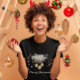 Festive Christmas t-shirt for your joyful Christmas holidays. Beautiful gold Christmas balls & silver pine surrounded by white snowflakes on black background give it a festive look. Perfect Christmas gift for your family and friends.