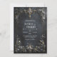 Invite your guests to a celebration of opulent luxury and dramatic elegance with this exquisite wedding invitation. The design features a stunning, rich dark navy and charcoal distressed background, giving it a luxurious, antique texture with subtle gold and gray veins. A prominent ornate gold baroque rectangular frame dominates the scene, heavily detailed with intricate scrolling foliage and blue floral accents. The top and bottom centers are anchored by large sculpted medallions featuring stunning faceted blue gemstones. This entire frame is lavishly draped with delicate blue forget-me-not style flowers and dark gold foliage. This aesthetic conveys a deep, sophisticated richness, perfectly setting the stage for a dramatic, high-end, or formal evening wedding. This invitation card is ideally suited for a masquerade ball wedding reception, a formal historic venue ceremony, or a sophisticated gala anniversary celebration. It would also perfectly suit a regal winter holiday engagement party or an elegant black tie New Year's Eve event. The card's captivating blend of ornate gold accents and deep-toned florals ensures it is versatile for any solemn ceremony, corporate gala, or refined birthday announcement.