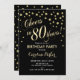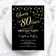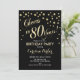 80th birthday party invitation. Elegant design in faux glitter gold and black. Features stylish script font and confetti. Cheers to 80 Years! Perfect for women's or men's milestone bday celebration. Personalize with your own details. Printed Zazzle invitations or instant download digital printable template.