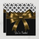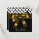 Elegant Fleur de Lis black and white with bright gold bow design party invitation. This template design works well as an invitation to a birthday party, cocktail party, holiday party, corporate party, black tie formal, prom, retirement party, graduation party, bachelorette party, engagement party, wedding, New Year's Eve party, and any other special occasion. Add your details to the front and back by simply choosing the orange "Customize it!" button to begin adding your event details, font style, font size & colour, and wording. Gold fleur de lis party invitations. Please note - all of the invitation designs you will find on Zazzle are printed graphics on flat paper stock with no actual jewels, bows, raised, embossed, or added parts or pieces.