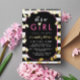 Gold and pink It's a girl baby shower invitation sprinkled with gold foil baby footprints. Striped it's a girl baby shower invitation tn a chic combo of black, pink, and gold foil. Retro girl baby shower invitation with stripes, baby feet, and pink details.