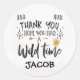 This wild one black watercolor and faux gold favour sticker features various text in different font styles and a few decorative elements on a scanned watercolor paper background image. Same design birthday invitation is also available at the store.