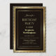 A modern 18th birthday party invitation featuring a gold border within a gold embellished diagonally striped frame.