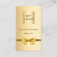 A faux gold looking background. Decorated with a golden bow. Personalize and add your business logo, name, title and contact information. Add your website url/link to the Qr code. With Facebook and Instagram icons. Black text.