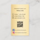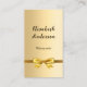 A faux gold looking background. Decorated with a golden bow.  Personalize and add your name, title and contact information.  Add your website url/link to the Qr code. With Facebook and Instagram icons. Black text.