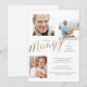 A beautiful and elegant three-photo collage in loving memory funeral invitation and announcement. Our design features a three-photo layout with "Memory" displayed in modern faux gold calligraphy. Personalize with your details. The reverse side features a simple faux gold cross in the middle.