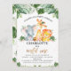 Cute wild one safari themed first birthday invitation for a baby girl featuring three cute watercolor safari animals and jungle foliage or greenery. The faux gold glitter word one is removable.