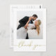 This design features a modern simple gold calligraphy script, a minimalist minimal two 2 photo, a wedding photo photography couple, a basic clean contemporary template, an elegant typography script text font, a photo wedding thank you cards, a custom customized personalized design, a golden handwritten lettering font, a creative simplistic elegant script, a calligraphy wedding budget friendly thank you cards