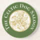 Stone coasters with customizable text and centre intricate gold and white Celtic dogs in disc shaped design on green background.