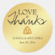 A pretty gold Celtic knot offers the promise of eternal love on this thank you wedding sticker. It's personalized with the bride and groom names and their wedding date. Love and Thanks is written in a modern text design. The thank you wedding sticker has an open and airy feeling.
