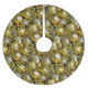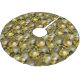 A golden Christmas tree skirt featuring a pattern of gold Christmas baubles and Christmas tree decorations to add a classy finishing touch to your Christmas tree these holidays.