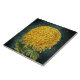 The vintage collage on this decorative ceramic tile features a beautiful golden yellow spider chrysanthemum against a distressed teal damask background, similar to retro wallpaper. Golden handwriting adds unique interest to the blue-green textured background. The flower featured on this tile is from an old public domain botanical illustration.