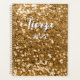 A modern bold name in white with a black drop shadow on a blank planner. The font size, colour and style are customizable. increase the font size for short names if you'd like. The background is a faux gold confetti or sequin glitter with sparkly spots or blurry bokeh.