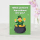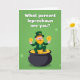 Designed with a rich emerald backdrop, this St. Patrick’s Day card features a cheerful cartoon leprechaun lounging in a wide black pot that’s overflowing with shiny gold coins 💚. He wears a green outfit with a buckled top hat, and his golden-orange beard frames a friendly face with wide eyes and a small, knowing smile. The leprechaun lifts two coins—one in each hand—as if showing them off to a close friend standing just outside the scene, turning the moment into a shared little joke. Behind him, the green background shifts in soft gradients and is dotted with faint, translucent shamrock shapes ☘️. Across the upper portion, the question “What percent leprechaun are you?” is set in large white lettering that stands out clearly against the darker greens. The pot and coins are layered for depth, and many coins include a small dollar sign that catches the light. The black pot sits centered near the bottom, with gold spilling up and around the leprechaun’s elbows in neat, rounded stacks.