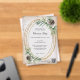 A frosted background. An oval faux gold frame decorated with cones, white berres and pine greenery. Faux silver glitter, sparkles. Personalize and add the details. Black text.