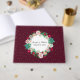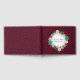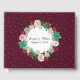 Pretty wedding guest book done in maroon, with graphics of gold tone confetti dots. A pretty floral wreath text area, on the front of the book, has custom text ready to personalize.