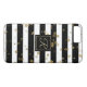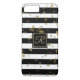 Modern black and white striped iPhone 7/8 Plus case, with graphics of gold tone confetti dots. A black square text area has a single letter monogram. Personalize the monogram to suit your needs.