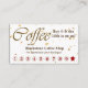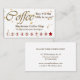 Keep your coffee customers coming back with this attractive discount loyalty card. The front of the card has "Coffee" in large brown script, and a gold confetti on white background. There are 3 text fields for you to customize, plus a punch out or mark off number series at the bottom ending with a red star. The back of the card is white, with 3 more custom text fields. This card may be easily adapted to a cafe or any establishment that sells coffee beverages.