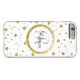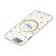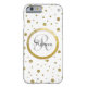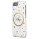 Add your custom name and initial to this pretty, light airy and feminine gold and silver confetti background print pattern design. Circular round shape with a faux gold leaf border and your single letter initial and name.
