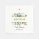 This image displays a beautifully designed baptism Paper Napkin. The top of the design features a simple, elegant cross symbol, indicative of the Christian significance of the event. Below the cross is a lush arrangement of watercolor greenery, with various shades of green leaves that add a fresh and natural touch to the design. The text is thoughtfully laid out with a mix of classic and modern fonts, emphasizing an elegant baptism ceremony. The name of the child is featured prominently, indicating the child to be baptized.