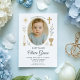 Elegant baptism invitation for a baby girl featuring soft gold religious icons, including a cross, candle, and chalice, with room for a personalized photo. A beautiful way to announce and celebrate this special spiritual milestone. Perfect for modern, traditional, or boho-inspired baptisms.