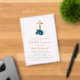 This elegant first communion invitation features a gold faux foil cross decorated at its base with a bouquet of turquoise flowers set off by delicate gold faux foil and glitter foliage. The customizable text combines gold-coloured handwriting script and charcoal grey copperplate font on a clear background.