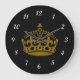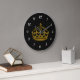 Gold Crown Wall Clock - is a graphics art design. The centre is a large decorative gold crown. The background is an embossed floral black pattern. The clock numbers are white. Feel free to personalize your clock with a name or other text as you like.
