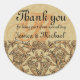 A sophisticated and elegant way to seal your wedding favour bags or wedding cake boxes. A round seal with a gold damask pattern and Victorian swirl pattern. An ornate monogram is above that. Written over this lovely design is a thank you message and the bride and groom names. All of the text is customizable and editable. Change the message and the text font, colour or size.