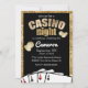 This custom invitation features a glitzy and glamourous Casino Night gambling party theme. Playing cards displaying four of a kind aces are printed across the bottom. Coins are pictured on either side of the text area. Casino is printed in a gold foil design with night printed below it in a gold diamonds pattern. The frame features a matching diamonds pattern over a black background.