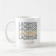 Bold letters spell out the word "LACROSSE" with the "O" replaced by a basket. The slightly distressed design makes a great personalized gift for a player, coach, team or fan. Available in red, orange, yellow, purple, green, blue, grey, black, forest green, navy, maroon, burnt orange, gold and powder blue. Matching products available.