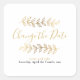 Gold effect leaves and branches change the date Square Sticker. Change the date envelope seal for your guests and invitations. This modern save the change sticker feature your names and wedding date with pretty gold effect leaves boarding "change the date" written in an elegant script.