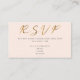 This modern RSVP enclosure card features a soft bridal pink background with a luxurious gold effect "RSVP" in elegant script, perfect for pairing with contemporary wedding suites. The minimalist layout provides clear space to include essential wedding day information such as venue, email, phone, and website on the reverse, keeping guest details organized and easy to reference. The gold appearance is printed for a refined look, and all text is fully editable to match specific plans and style.